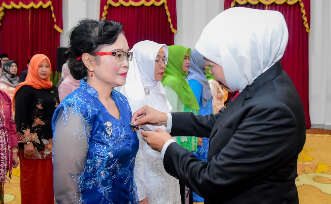 Momen saat Gubernur Jawa Timur Khofifah Indar Parawansa menyematkan Tanda Kehormatan Republik Indonesia Satyalencana Karya Satya kepada salah satu guru di gedung Negara Grahadi.