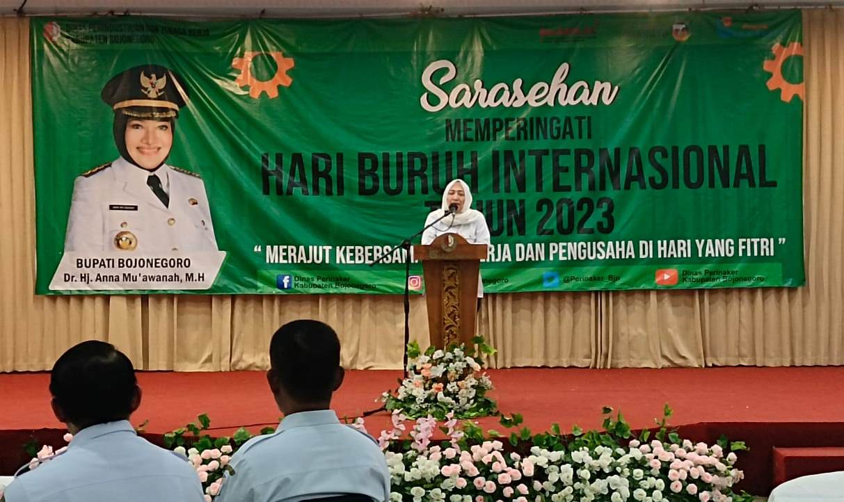 Bupati Bojonegoro Anna Mu’awanah hadir dan membuka sarasehan itu. Dalam sambutannya, Bupati Anna menyampaikan peringatan May Day atau Hari Buruh Internasional di Bojonegoro berjalan kondusif. “Hal ini tidak terlepas dari komunikasi produktif dan mutualisme simbiosisme yang baik antara pengusaha, pekerja dan Pemkab Bojonegoro,” ungkapnya.