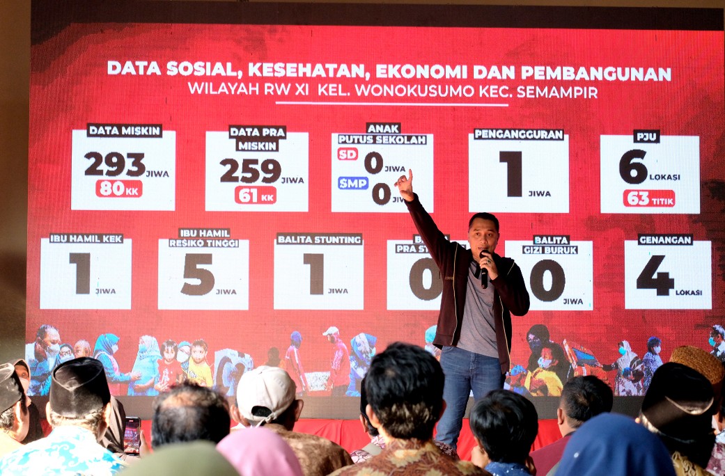Dalam kesempatan itu, Wali Kota Eri Cahyadi membahas sejumlah persoalan yang ada di wilayah RW XI. Mulai dari balita stunting, risiko angka kematian ibu dan bayi, Penerangan Jalan Umum (PJU), pengangguran, kemiskinan hingga genangan. Sejumlah persoalan itu pun langsung dipetakan dan ditarget rampung dalam beberapa bulan ke depan.
