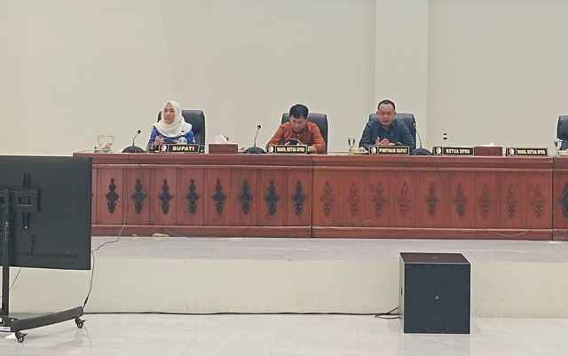Bupati Bojonegoro Anna Mu’awanah bersama pimpinan DPRD Bojonegoro dalam rapat paripurna di gedung DPRD Bojonegoro.