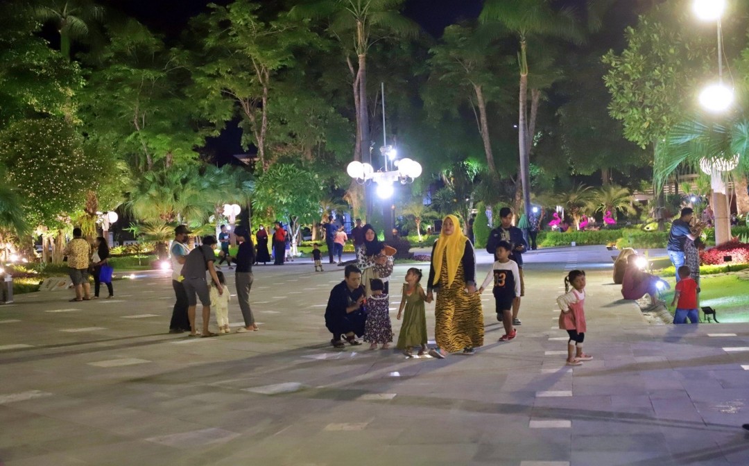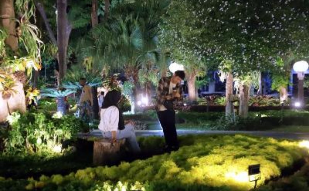 Para pengunjung itu berdatangan mulai habis magrib. Mereka biasanya membawa anak-anaknya untuk bermain di taman tersebut. Para anak-anak pun riang gembira berada di taman yang luas itu. Apalagi, fasilitas di taman itu kian lengkap dengan adanya burung-burung di sangkar besar beserta kolam ikannya. Bahkan, penerangan lampunya juga sangat indah.