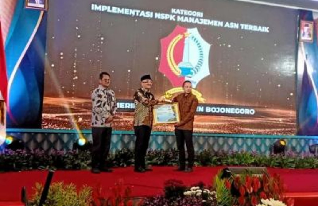 Penghargaan diserahkan langsung oleh Plt Kepala Badan Kepegawaian Negara Bima Haria Wibisana kepada Pemkab Bojonegoro yang diwakili oleh Kepala Badan Kepegawaian, Pendidikan dan Pelatihan (BKPP) Kabupaten Bojonegoro Aan Syahbana.