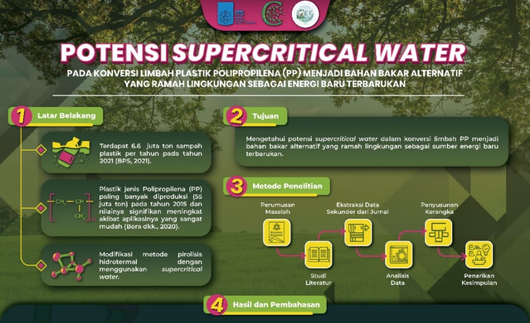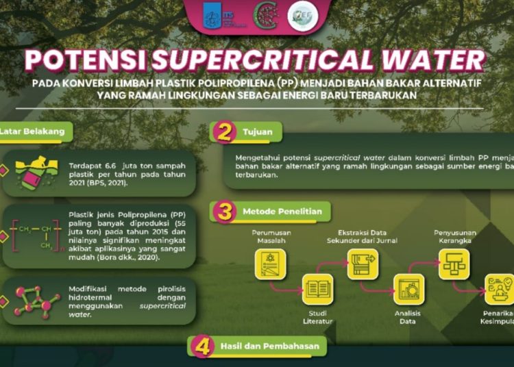SURABAYATODAY.ID, SURABAYA – Tim mahasiswa Institut Teknologi Sepuluh Nopember (ITS) menggagas inovasi terkait potensi yang dimiliki Supercritical Water (SCW) sebagai pengurai plastik Polipropilena (PP) menjadi bahan bakar alternatif setara bensin. Hal ini dikarenakan SCW sebagai salah satu proses fluida yang sangat berguna untuk mengurai limbah plastik, ternyata masih kurang digunakan penerapannya di dunia industri saat ini.