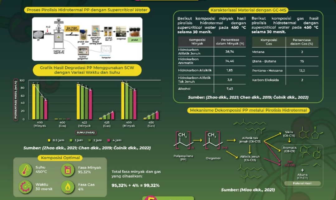Sejalan dengan hal tersebut, mahasiswa Departemen Kimia ITS itu menambahkan, proses untuk menguraikan limbah plastik itu sendiri membutuhkan waktu yang lama. Di samping itu, metode penguraian yang selama ini dilakukan untuk mengonversi plastik PP, seperti metode pirolisis hidrotermal terbilang cukup mahal.