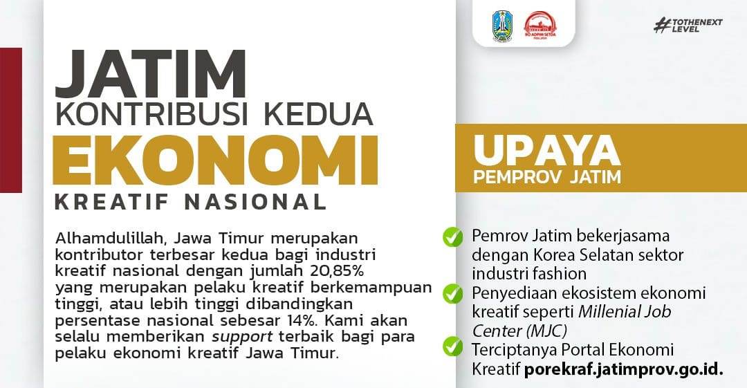 Berdasarkan data dari Sekretaris Badan Strategi Kebijakan Luar Negeri Kemenlu RI Nina Kurnia mengatakan Jawa timur memiliki pelaku ekonomi kreatif berkemampuan tinggi. Hal tersebut dibuktikan dengan kontribusinya terhadap ekonomi kreatif nasional dengan capaian 20,85 persen dibandingkan dengan capaian nasional yang berada pada angka 14 persen. Sementara fashion menjadi kontributor ke-3 terbesar bagi industri ekonomi Kreatif Jawa Timur selain kuliner dan Griya.