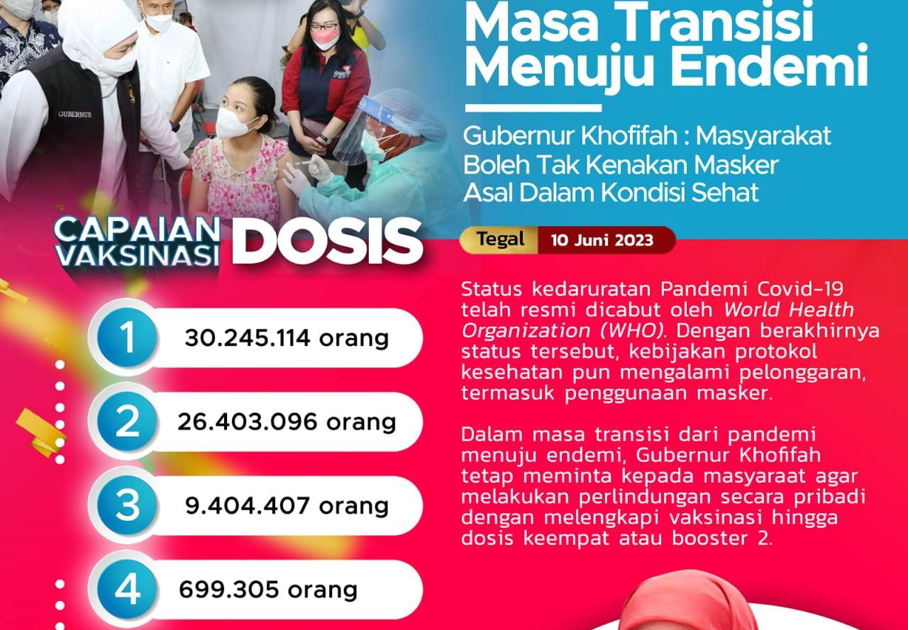 Gubernur Jawa Timur Khofifah Indar Parawansa menyampaikan, masyarakat diperbolehkan tidak mengenakan masker asal dalam kondisi sehat dan tidak berisiko tertular atau menularkan Covid-19. Hal ini juga tertuang dalam Surat Edaran Satuan Tugas Penanganan Covid-19 Indonesia nomor 1 tahun 2023 tentang Protokol Kesehatan Pada Masa Transisi Endemi Covid-19.