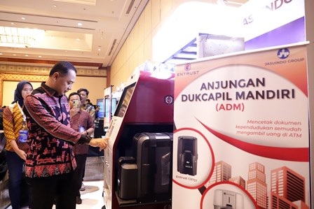Wali Kota Surabaya Eri Cahyadi mencoba salah satu anjungan Dukcapil Mandiri yang dipamerkan di Forum Smart City Nasional 2023.
