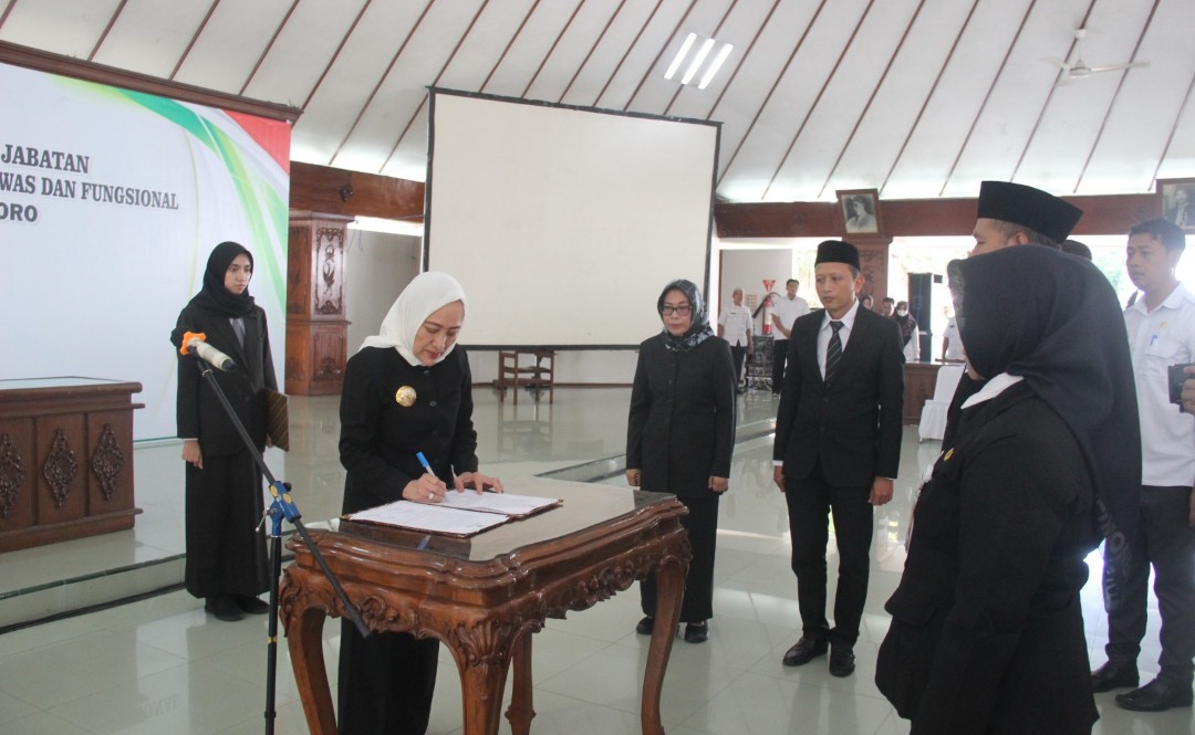 Bupati Bojonegoro Anna Mua’awanah pada pelantikan sejumlah pejabat di lingkup Pemkab Bojonegoro.