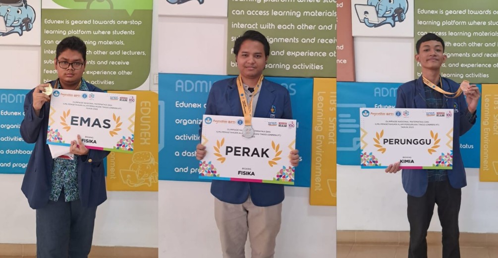Tiga mahasiswa ITS yang berhasil menyumbangkan prestasi tersebut adalah Izzudin Ali Yafi yang meraih medali emas di bidang Fisika, Zamrori Sudi Maulana meraih medali perak di bidang Fisika juga, dan Andhika Fathurrohman yang meraih medali perunggu di bidang Kimia. “Pada ONMIPA-PT tahun ini terdapat peningkatan yang positif dengan raihan medali emas yang sudah cukup lama tidak didapatkan ITS,” ungkap Koordinator Kegiatan ONMIPA-PT 2023 dari ITS Dr rer nat Bintoro Anang Subagyo SSi MSi.