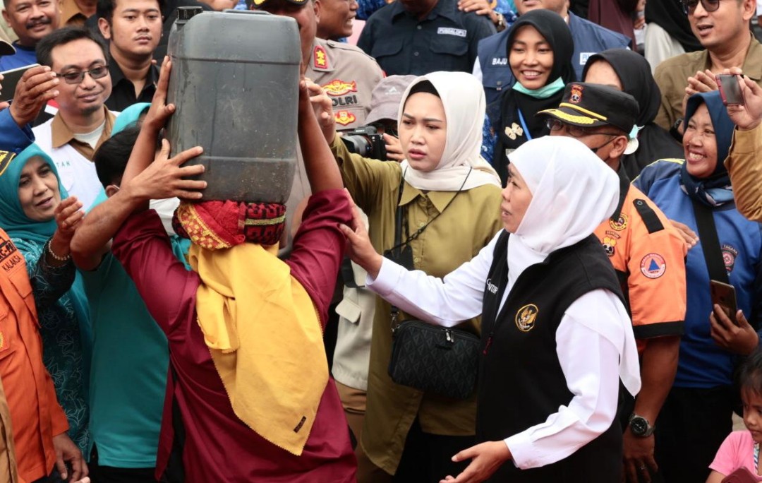 Gubernur Jawa Timur Khofifah Indar Parawansa gerak cepat dengan memantau langsung pelaksanaan distribusi air bersih di daerah yang mengalami kekeringan di Desa Kunjorowesi, Senin (19/6). Setibanya di lokasi, Gubernur Khofifah dengan didampingi Bupati Mojokerto Ikfina Fahmawati, memastikan bahwa proses distribusi air bersih menggunakan mobil tangki kapasitas 4.000 liter berjalan dengan baik.