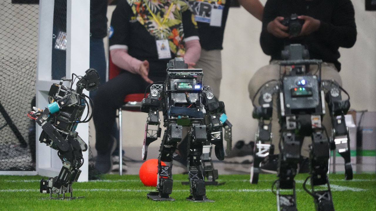 Robot Tim Ichiro saat hendak mencetak gol ke kandang lawan pada kategori Kontes Robot Sepak Bola Indonesia-Humanoid di ajang Kontes Robot Indonesia (KRI) 2023.