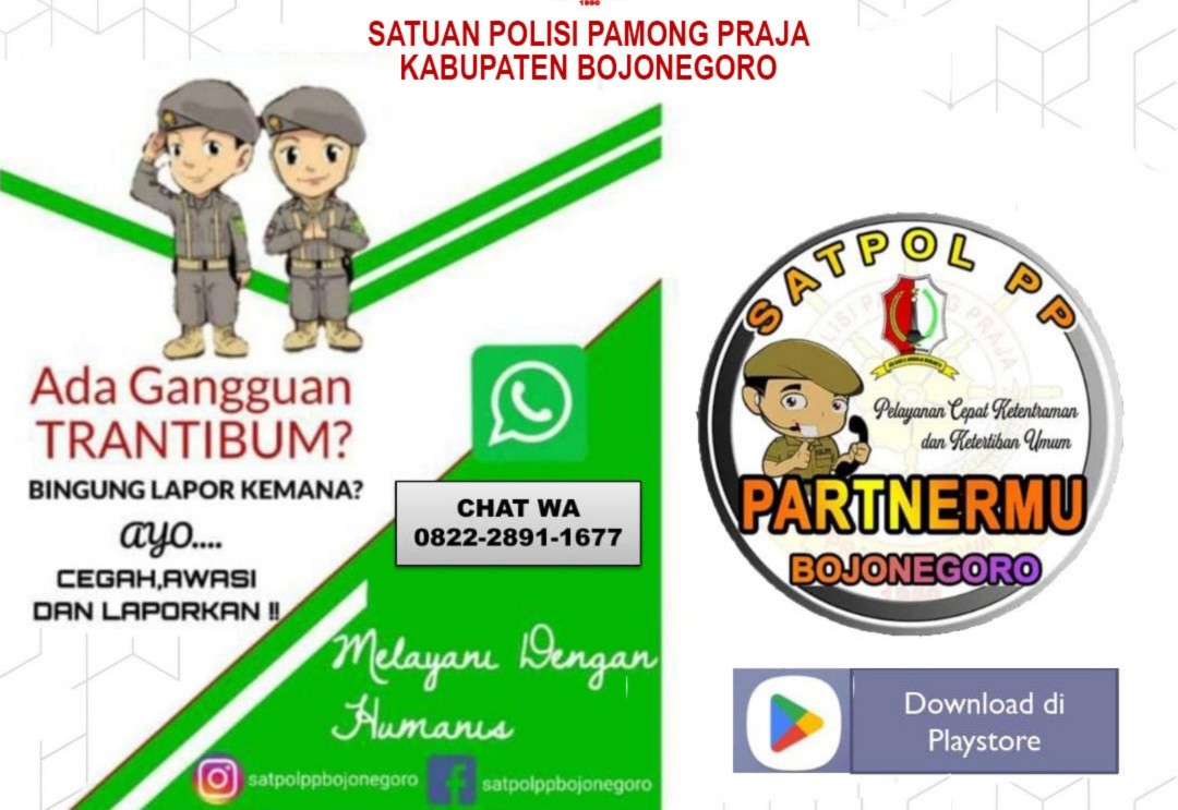 Arif Nanang menambahkan bahwa layanan pengaduan tersebut melalui WhatsApp dengan nomor kontak 082228911677. Kemudian, instagram @satpolppbojonegoro, twitter @satpolpp, website satpolpp.bojonegorokab.go.id dan facebook @satpolppbojonegoro. Atau melalui aplikasi satpol pp partnermu Bojonegoro yang bisa diunduh di playstore @play.google.com.