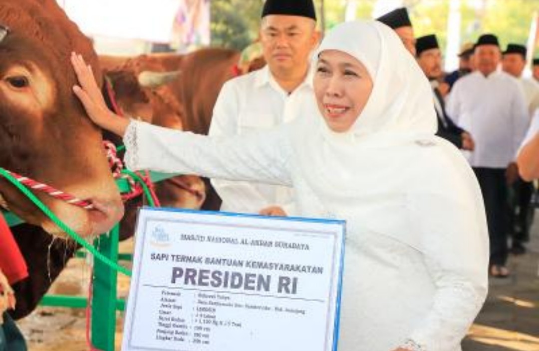 SURABAYATODAY.ID, SURABAYA – Usai melaksanakan Salat Id di Masjid Al Akbar Surabaya (MAS), Gubernur Jatim Khofifah Indar Parawansa melakukan penyerahan hewan kurban secara simbolik di Taman Asmaul Husna di halaman MAS. Beberapa hewan kurban yang diserahkan antara lain sapi kurban dari Presiden RI Joko Widodo, sapi kurban Gubernur Jatim, sapi kurban Dankodiklatal, sapi kurban Wakil Gubernur Jatim, ketua DPRD Jatim, Pangdam V Brawijaya, Kapolda Jawa Timur, Pangkoarmada II, Kajati Jatim, serta sapi kurban Sekda Prov Jatim.