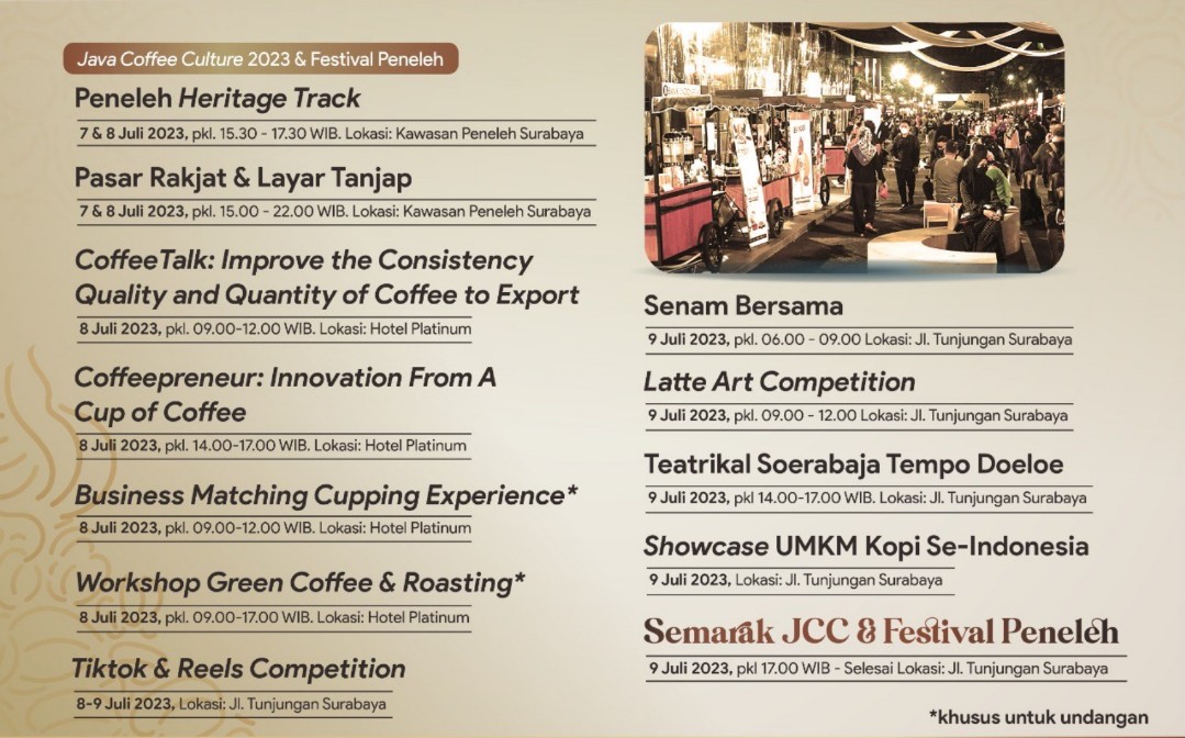Untuk menggali potensi itu lebih dalam, Pemerintah Kota (Pemkot) Surabaya berkolaborasi bersama Bank Indonesia (BI) menggelar event Java Coffee Culture (JCC) 2023 & Festival Peneleh. Acara ini, rencananya digelar pada tanggal 7-9 Juli 2023 di Jalan Tunjungan dan kawasan Peneleh, Kecamatan Genteng.