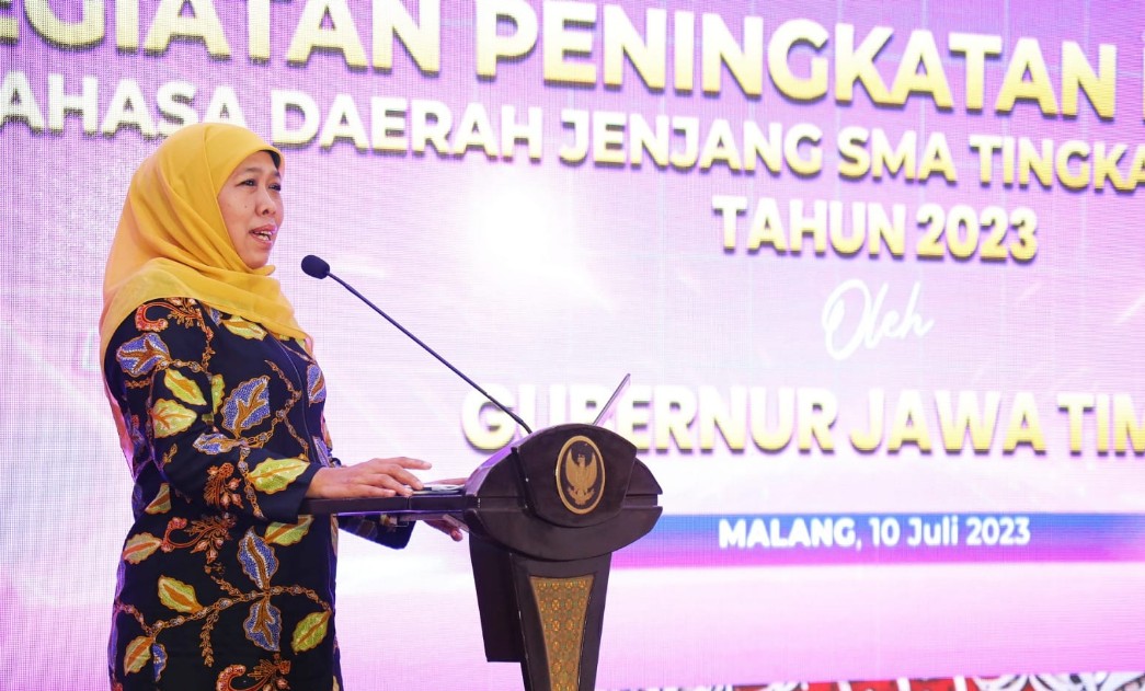 SURABAYATODAY.ID, SURABAYA – Gubernur Jawa Timur Khofifah Indar Parawansa membuka Kegiatan Peningkatan Kompetensi Guru Bahasa Daerah Jenjang SMA Tingkat Prov. Jatim Tahun 2023 di Hotel Montana Dua, Kota Malang, Senin (10/7) malam. Ia menyampaikan pentingnya revitalisasi bahan ajar, metodologi serta peran guru bahasa daerah sebagai ujung tombak pembangunan karakter dan pelestarian budaya daerah.