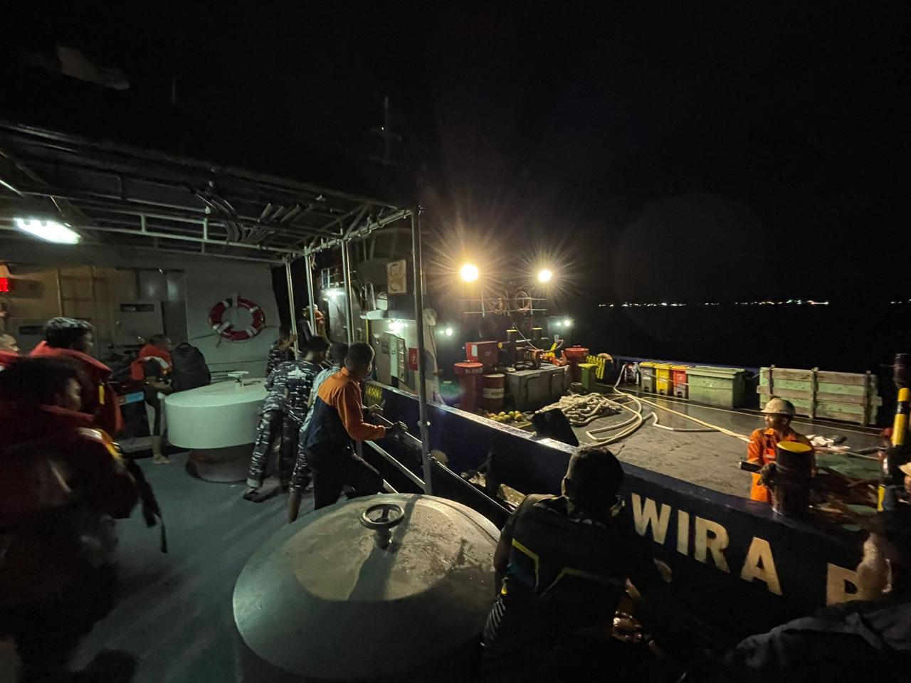 Dua personel lainnya yakni Nahkoda dan Kepala Kapal Mesin (KKM) SPOB Ratu Yamani dibawa dari KRI ECL-871, menuju kapal SPOB Ratu Yamani untuk melaksanakan pengecekan pada bagian kapal yang terbakar. (ST03)