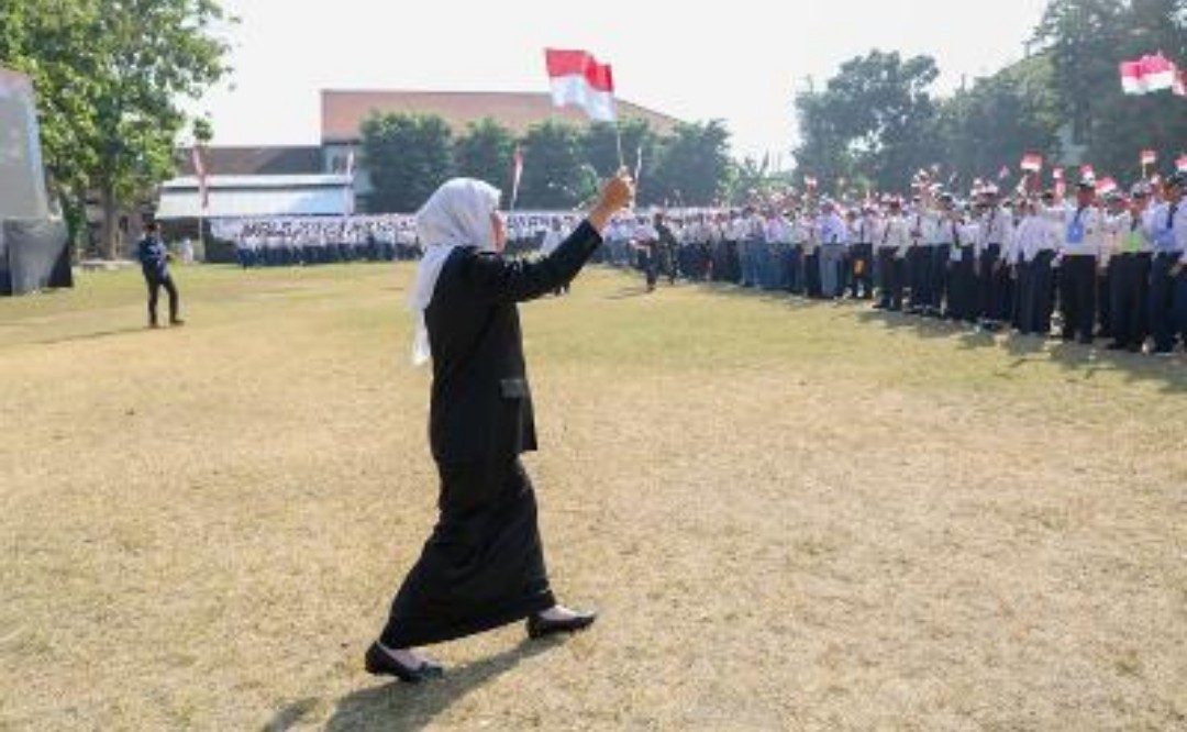 Gubernur Jatim Khofifah Indar Parawansa pada pmbukaan MPLS jenjang SMA/SMK/SLB serentak di SMKN 5 Surabaya.