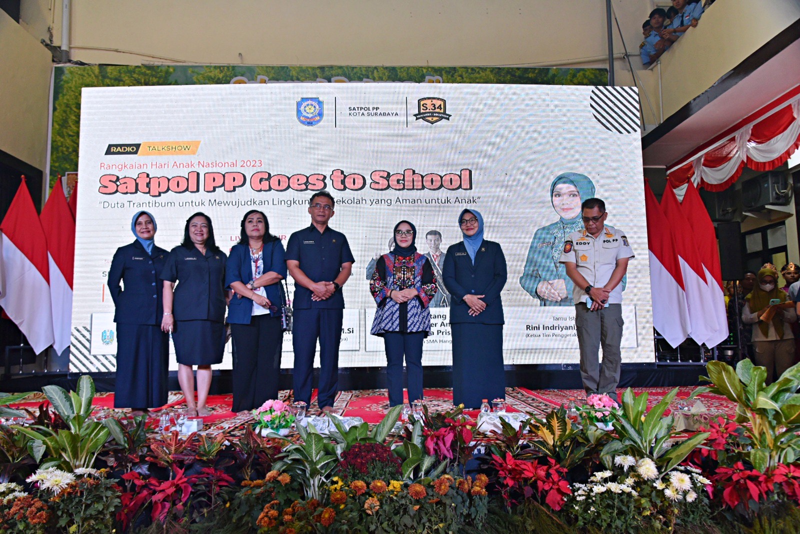Roadshow Satpol PP Goes To School kali ini, dilaksanakan di SMA Hang Tuah 4 Surabaya yang bertujuan memberikan sosialisasi dan edukasi untuk mencegah terjadinya tawuran antar pelajar, Selasa (1/8/2023).