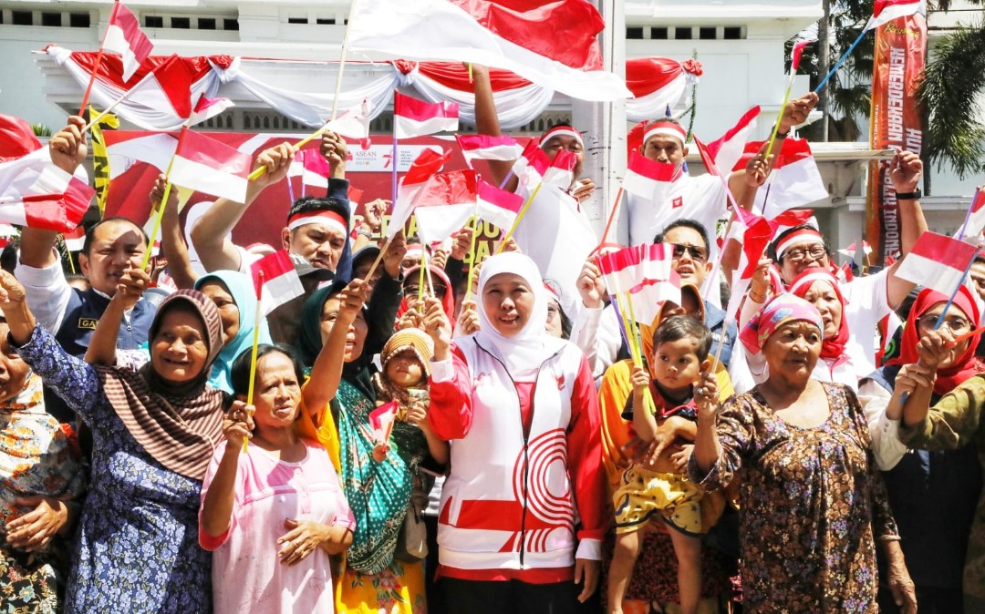 Pembagian tahap pertama sebanyak 1000 bendera dan sembako, dilakukan Khofifah usai memberangkatkan TKSK dan Tagana yang menyalurkan tali asih bagi Perintis Kemerdekaan, Janda Perintis Kemerdekaan, dan ahli waris pahlawan nasional di halaman Kantor Gubernur Jatim, Minggu (13/8).