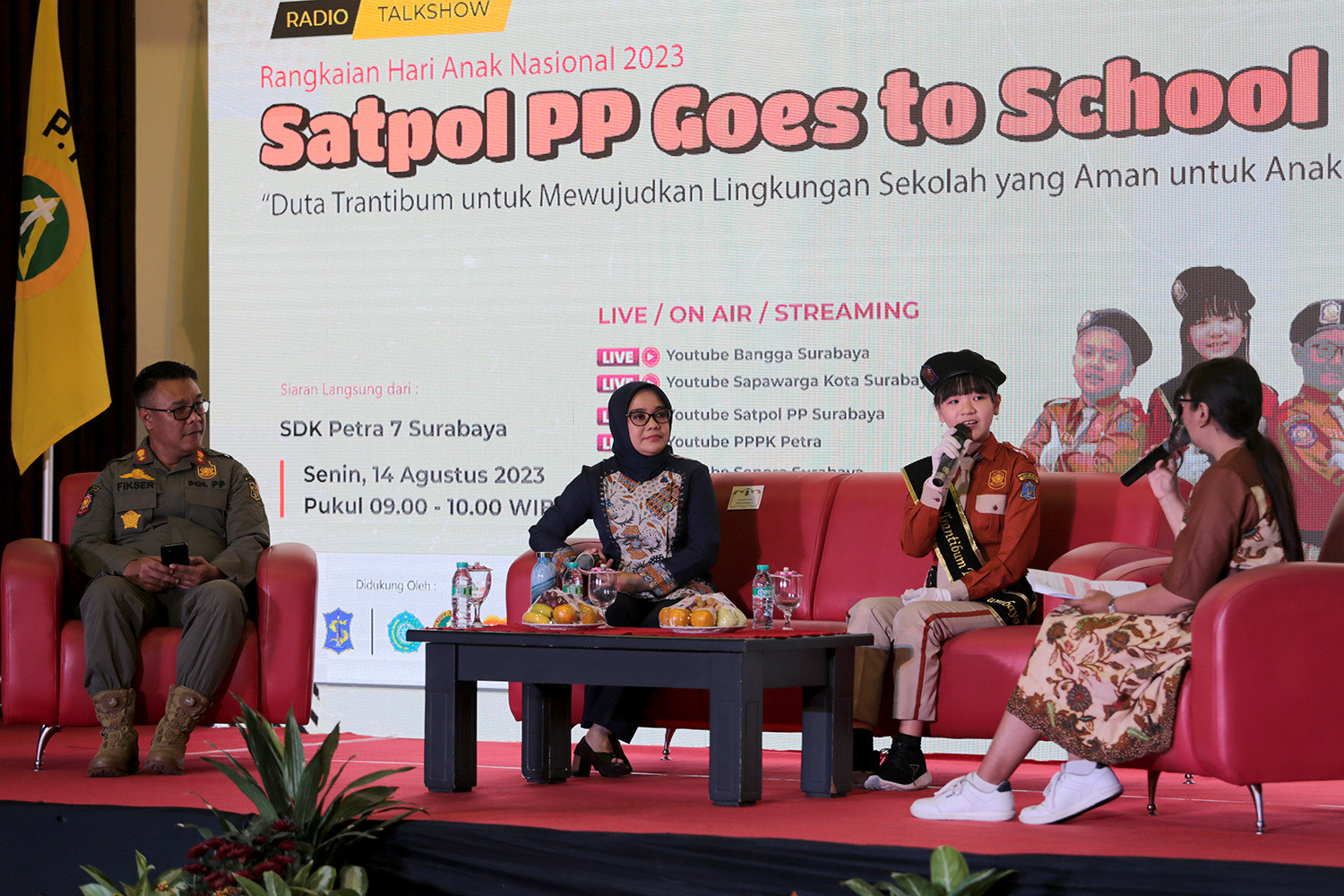 Pada kesempatan tersebut, Ketua Tim Penggerak (TP) PKK Surabaya Rini Indriyani, Kepala Satpol PP Surabaya Muhamad Fikser, beserta perwakilan Duta Trantibum SDK Petra 7 Kota Surabaya Christabel Lorenza Gunandhie berkesempatan menjadi narasumber dalam pelaksanaan Roadshow Satpol PP Goes To School.