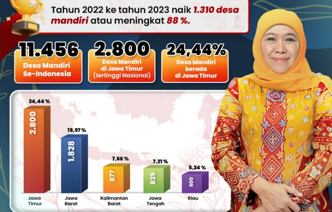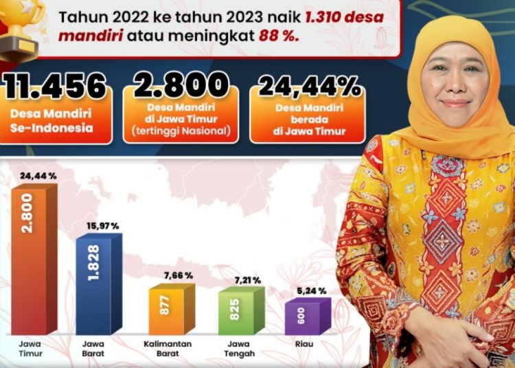 Jumlah desa mandiri di Jatim pada 2023 naik drastis dibanding tahun 2022 sebelumnya. Saat itu tercatat hanya ada 1.490 desa mandiri di Jatim. “Tahun ini jumlahnya bertambah 1.310 desa mandiri menjadi 2.800 desa atau naik 88 persen. Ini prestasi luar biasa,”