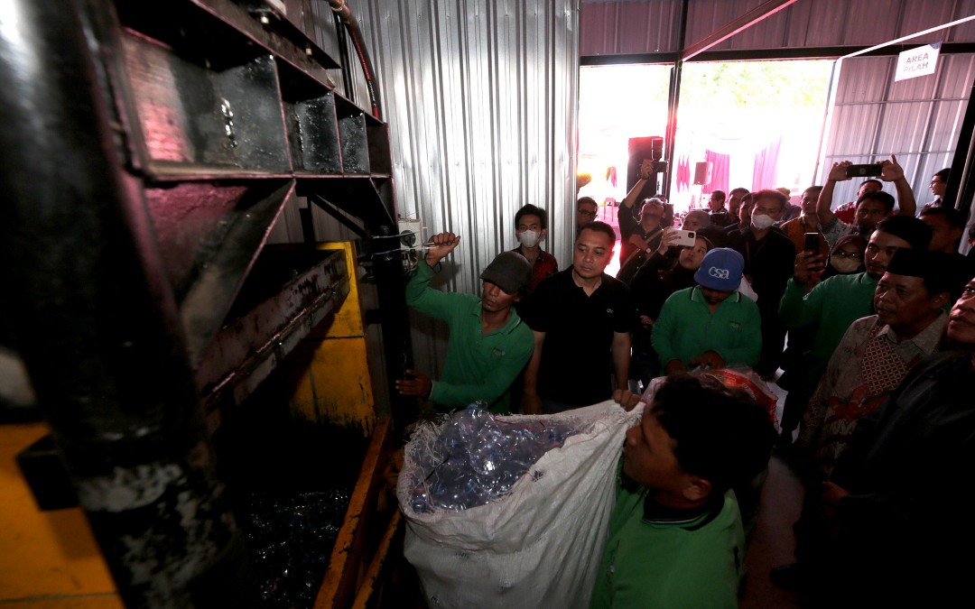 Eri juga sempat meninjau ruangan-ruangan di Bank Sampah itu. Bahkan, ia juga sempat melihat mesin pres botol bekas. Ia juga membantu memasukkan botol-botol itu ke mesin pres itu.