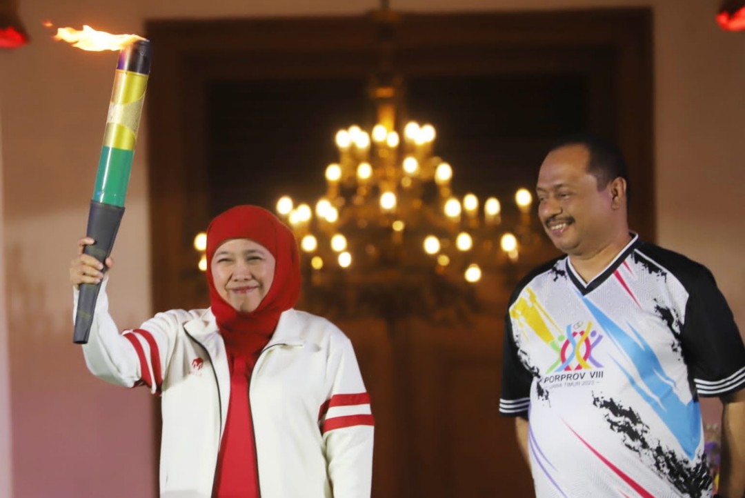 Saat menerima kirab obor api, Khofifah didampingi Sekretaris Daerah Prov Jatim, Adhy Karyono, Ketua Panitia Besar (PB) Porprov Jatim VIII, M Ali Affandi, Kepala Dinas Pemuda dan Olahraga Prov Jatim Moh. Ali Kuncoro serta Ketua KONI Jatim, M. Nabil.