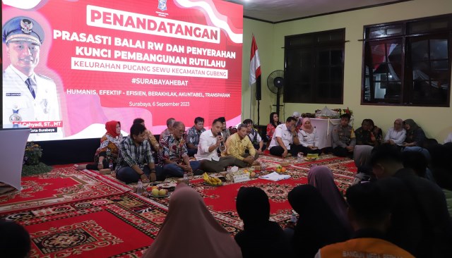 Wali Kota Surabaya Eri Cahyadi dalam peresmian balai RW. Ia meminta perangkat daerah Pemkot Surabaya turun ke balai RW untuk mendekatkan pelayanan kepada warga.