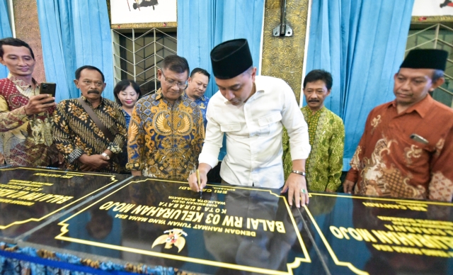 Wali Kota Surabaya Eri Cahyadi menandatangani prasasti saat saat peresmian balai RW secara serentak yang dipusatkan di Balai RW 04, Kelurahan Gayungan, Kecamatan Gayungan.