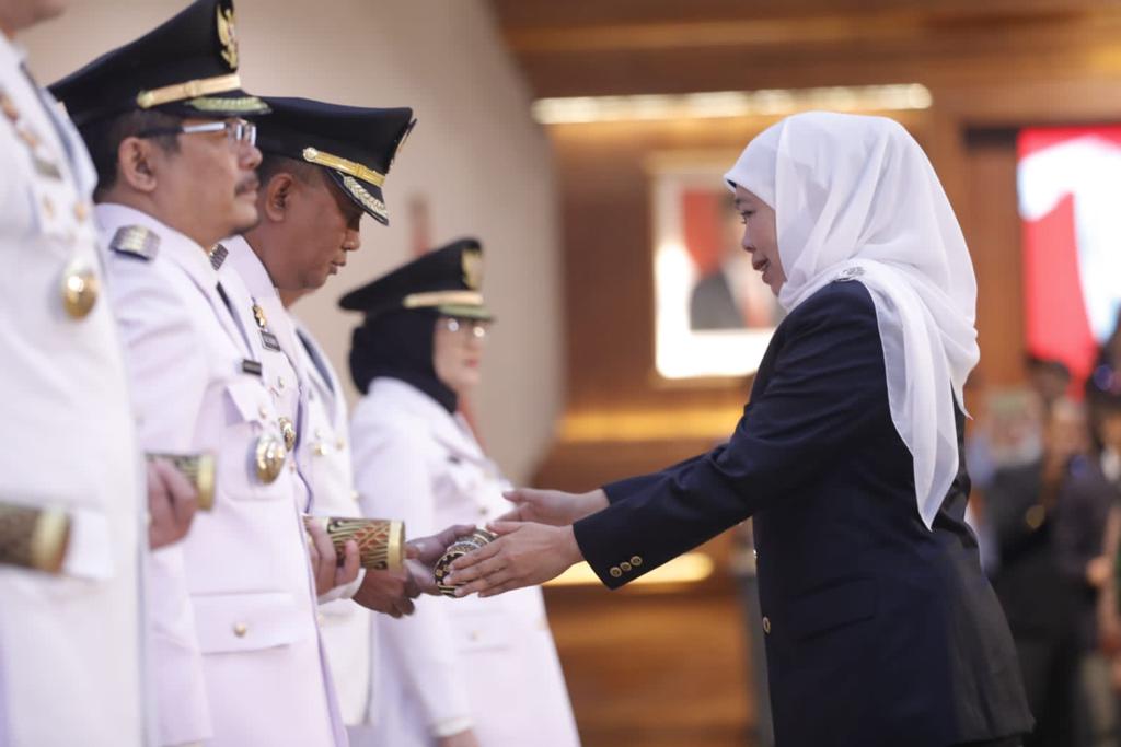 SURABAYATODAY.ID, SURABAYA – Gubernur Jawa Timur Khofifah Indar Parawansa melantik dan mengambil sumpah jabatan enam Penjabat (Pj) Bupati untuk kabupaten yang kepala daerahnya habis masa jabatannya hari ini, di Gedung Negara, Grahadi, Surabaya, Minggu (24/9).