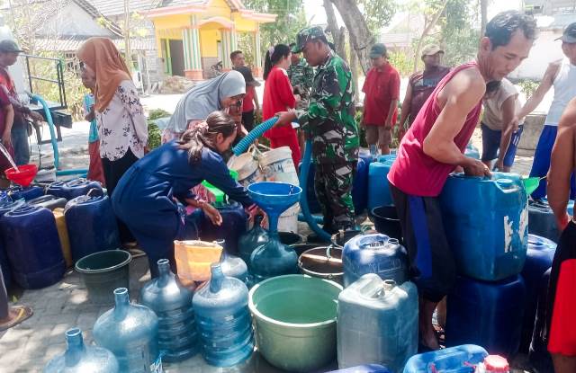 Distribusi air bersih yang dilakukan Kodim Bojonegoro kepada warga yang wilayahnya kekeringan dan kesulitan air.
