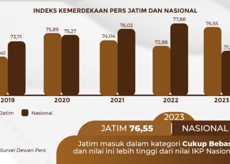 SURABAYATODAY.ID, SURABAYA – Indeks Kemerdekaan Pers (IKP) Jawa Timur naik signifikan di tahun 2023. Berdasarkan hasil survei IKP Indonesia yang diselenggarakan Dewan Pers tahun 2023, IKP Jatim ada di angka 76,55.