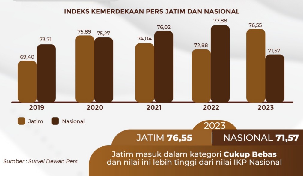 SURABAYATODAY.ID, SURABAYA – Indeks Kemerdekaan Pers (IKP) Jawa Timur naik signifikan di tahun 2023. Berdasarkan hasil survei IKP Indonesia yang diselenggarakan Dewan Pers tahun 2023, IKP Jatim ada di angka 76,55.
