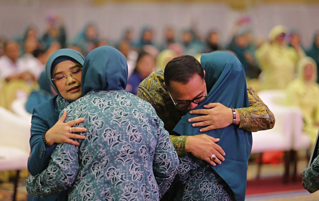 Wali Kota Surabaya Eri Cahyadi dan Ketua TP PKK Kota Surabaya Rini Indriyani memeluk kader PKK  pada peringatan Hari Kesatuan Gerak PKK ke-51.