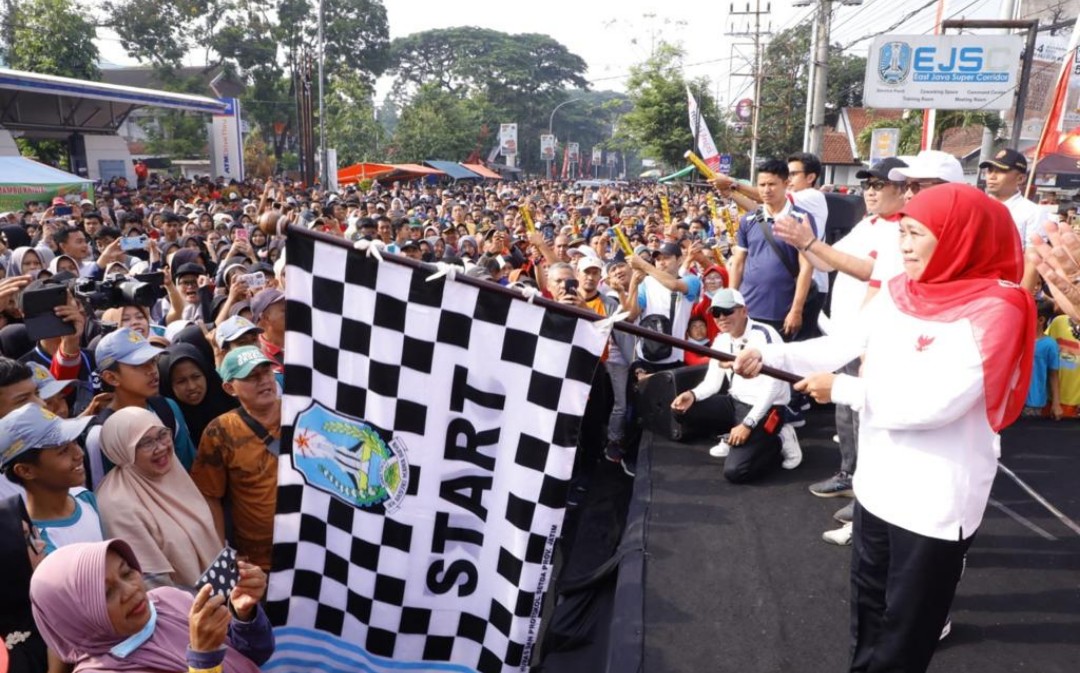 SURABAYATODAY.ID, SURABAYA – Gubernur Jawa Timur Khofifah Indar Parawansa bersama ribuan masyarakat mengikuti jalan sehat dalam rangka peringatan Hari Jadi ke-78 Provinsi Jawa Timur di depan Kantor Bakorwil V Jember, Minggu (5/11) pagi.
