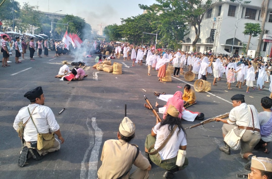 Teatrikal perang 10 November 1945 usai, laskar putri menutupi jasad arek-arek Suroboyo yang gugur dengan kain merah putih dan diiringi pembacaan puisi oleh Ketua Tim Penggerak (TP) PKK Kota Surabaya Rini Indriyani dengan judul Gugur.