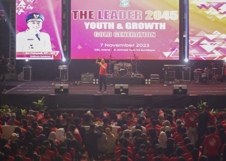 SURABAYATODAY.ID, SURABAYA – Pemerintah Kota (Pemkot) Surabaya bersama Karang Taruna Surabaya menggelar The Leader 2045 Youth & Growth Gold Generation di DBL Arena, Selasa (7/11) malam. Hadir dalam acara itu sebanyak 5 ribu pemuda dan pemudi Surabaya dari berbagai organisasi, mulai dari perwakilan Karang Taruna se Surabaya, paskibraka, Cipayung plus dan berbagai organisasi pemuda lainnya.
