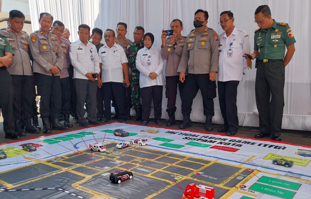 Simulasi tingkat kerawanan Tactical Floor Game Sistem Pengamanan Dalam Kota (SISPAMKOTA) yang menjadi rangkaian kegiatan awal Deklarasi Pemilu Damai di Bojonegoro.