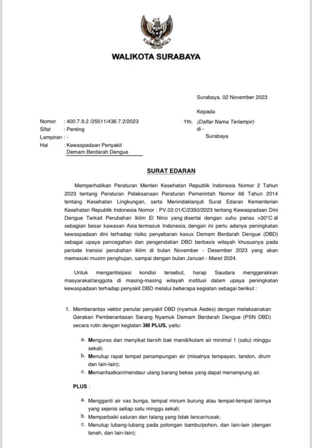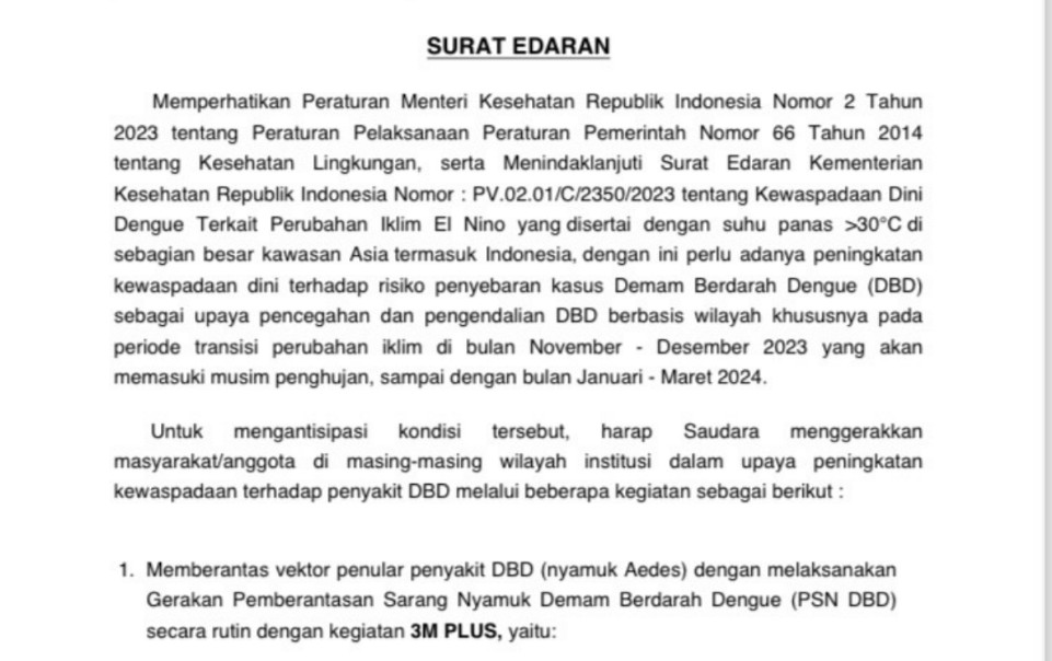 Imbauan itu disampaikan pemkot melalui Surat Edaran (SE) Wali Kota Surabaya Eri Cahyadi Nomor 400.7.9.2/ 25511/ 436.7.2/ 2023. Dalam SE itu, Wali Kota Eri meminta masyarakat untuk melaksanakan Gerakan Pemberantasan Sarang Nyamuk (PSN) DBD secara rutin dengan kegiatan 3M Plus.