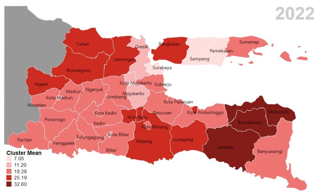Namun yang menarik ada di Klaster Lima, dimana secara spasial ada dua kelompok, yakni Kabupaten Sampang dan Kabupaten Pamekasan, serta Kota Surabaya dan Kota Mojokerto.
