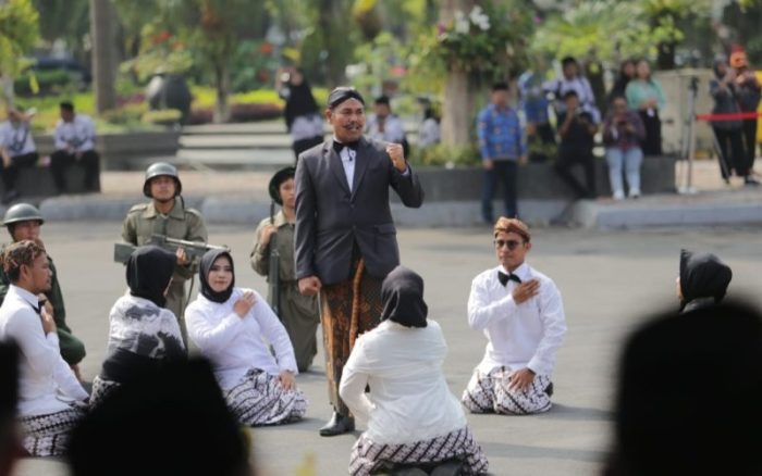 Aksi teatrikal ditampilkan dalam peringatan Hari Guru Nasional dan Hari Ulang Tahun (HUT) Persatuan Guru Republik Indonesia (PGRI) ke-78, sekaligus peringatan HUT KORPRI di halaman Taman Surya, Surabaya.