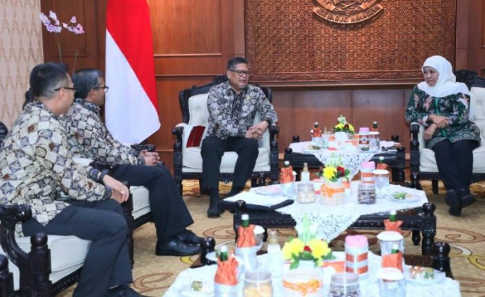 SURABAYATODAY.ID, SURABAYA -Gubernur Jawa Timur Khofifah Indar Parawansa menerima audiensi pimpinan Otoritas Jasa Keuangan (OJK) Regional 4 Jawa Timur di Gedung Negara Grahadi, Selasa (5/12). Mereka di antaranya Kepala OJK Regional 4 Jawa Timur Giri Tribroto, Direktur Lembaga Jasa Keuangan (LJK) 1 OJK Jatim Nasirwan, Kepala Bagian (Kabag) Kemitraan Pemerintah Ferah M Sulaiman.