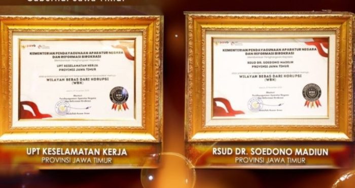 Dua instansi tersebut adalah RSUD dr Soedono Madiun dan UPT Keselamatan Kerja, Dinas Tenaga Kerja dan Transmigrasi Provinsi Jatim. Dimana Predikat WBK ini diraih setelah melalui proses penilaian ketat berdasarkan kualitas pelayanan yang baik dan berintegritas.