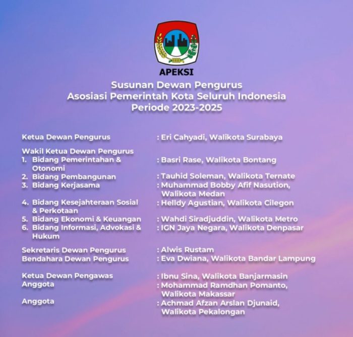 “Saya ingin memberikan Apeksi untuk negeri. Jadi, semua kelebihan yang ada di setiap kota akan kita kumpulkan, untuk penanganan kemiskinan, penanganan stunting. Setiap kota kan punya aplikasi dan punya cara tersendiri, sehingga nanti aplikasi itu akan kita jadikan satu, kemudian diterapkan di semua kota,” katanya, Sabtu (16/12).