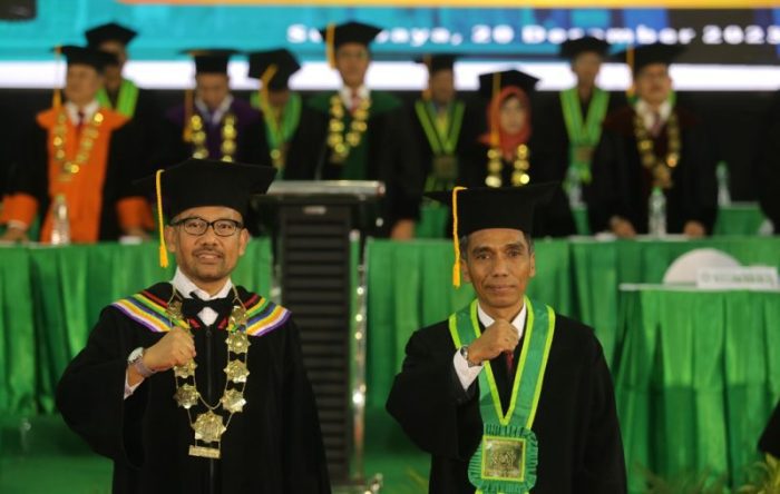 SURABAYATODAY.ID, SURABAYA – Wali Kota Surabaya Eri Cahyadi menghadiri Pengukuhan Guru Besar Ilmu Bidang Teologi Islam Kontemporer Universitas Islam Negeri Sunan Ampel (UINSA) Surabaya ke-88, Achmad Muhibbin Zuhri, di gedung KH. Syaifudin Zuhri Sport Center UINSA, Rabu (20/12). Dalam pengukuhan Guru Besar Fakultas Tarbiyah dan Keguruan (FTK) itu, juga dihadiri oleh Rektor UINSA Surabaya Akhmad Muzakki serta jajaran guru besar lainnya.