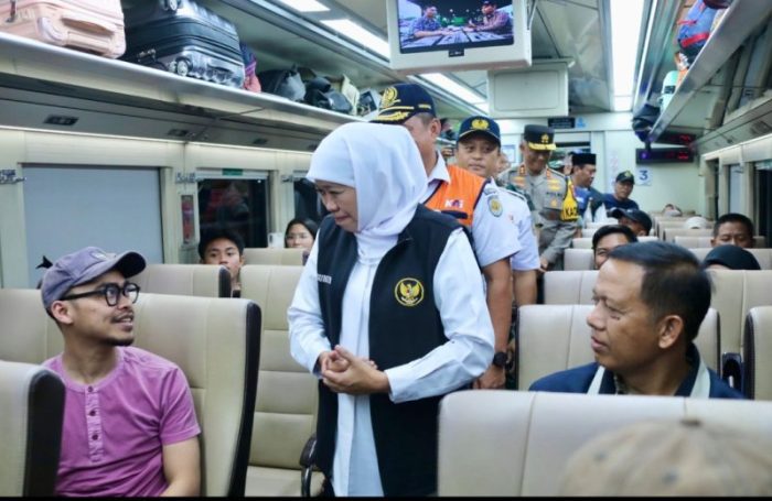 Gubernur Khofifah beserta rombongan menyapa langsung para penumpang kereta Mutiara Selatan jurusan Surabaya-Bandung. Sebagian besar penumpang hendak berlibur maupun pulang kampung mengunjungi sanak saudara di momen libur Nataru.