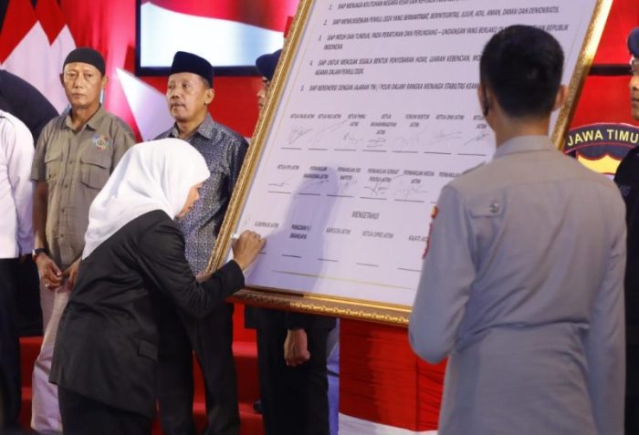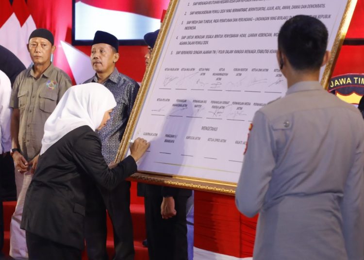 SURABAYATODAY.ID, SURABAYA – Gubernur Jawa Timur Khofifah Indar Parawansa bersama Forkopimda Jatim dan berbagai elemen masyarakat Jatim  menandatangani deklarasi pemilu damai 2024 di Gedung Mahameru Polda Jatim, Kamis (28/12). Deklarasi ini dilaksanakan sebagai wujud komitmen bersama mewujudkan pesta demokrasi yang aman dan damai sehingga persatuan dan kesatuan bangsa tetap terjaga.