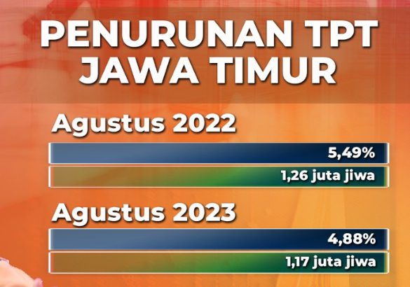 Gubernur Khofifah menjelaskan, secara year-on-year, Jatim berhasil menurunkan TPT lebih banyak dari pada rata-rata nasional. Tercatat, TPT nasional pada Agustus 2023 sebesar 5,32 persen dan hanya turun 0,54 persen poin dibanding Agustus 2022.