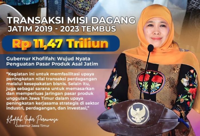SURABAYATODAY.ID, SURABAYA – Pemerintah Provinsi Jawa Timur di bawah kepemimpinan Gubernur Khofifah Indar Parawansa selama 2019 – 2023 mencatatkan nilai transaksi misi dagang baik dalam dan luar negeri Rp 11,47 triliun.
