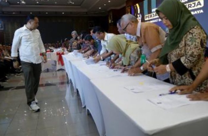 SURABAYATODAY.ID, SURABAYA – Wali Kota Surabaya Eri Cahyadi kumpulkan seluruh jajaran Perangkat Daerah (PD) Pemerintah Kota (Pemkot) Surabaya di Graha Sawunggaling, Jumat (12/1). Mulai dari kepala PD, Kepala Bidang (Kabid), camat, kurah, hingga kepala Puskesmas berkumpul jadi satu. Mereka serentak menandatangani kontrak kinerja.